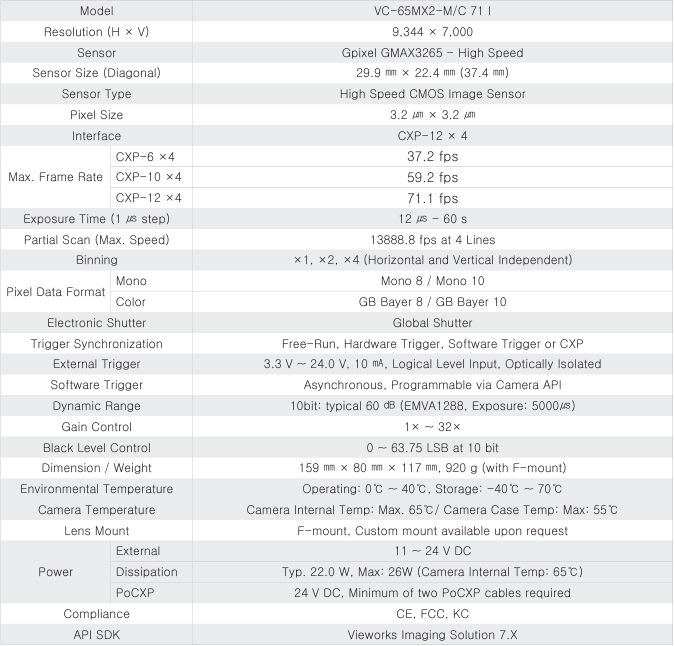 The VC-65MX2-M/C 71 I, the latest model of the industrial proven VC series, is a new 65-megapixel CoaXPress camera and based on the CMOS global shutter image sensor technology (GMAX3265) from Gpixel. The VC-65MX2-M/C 71 I offers up to 71.1 frames per second at 9,344 × 7,000 resolution. The camera comes with the next generation CoaXPress 2.0 (CXP-12) interface delivering up to 50 Gigabits per second over four coaxial cables. These combinations of the CMOS sensor technology and CoaXPress 2.0 interface set a new standard for industrial, scientific and surveillance digital imaging applications. Equipped with the Vieworks’ innovative technologies proved by world’s top FPD manufacturers, the VC-65MX2-M/C 71 I camera offers not only highly uniformed images but also high speed image processing capabilities. Featured with high-quality image uniformity and high-resolution, this camera is ideal for demanding applications such as FPD, PCB and semiconductor inspections.